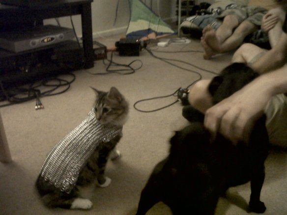 Not too surprisingly, Ragnarok was slightly less-than-thrilled about having his own armor to wear. But he is a very brave kitten, and although he looks at me with very sad eyes when I put the chainmail on him, he wears it with a stoic grace. And by “stoic grace,” I mean, “occasionally and unexpectedly falls off chairs because the weight throws off his center of gravity.”