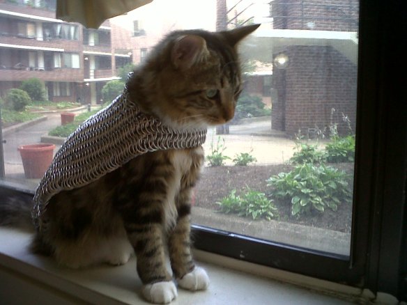 Every cat should own a set of sturdy armor, of course. It provides valuable protection for the spine and flanks when an inevitable battle breaks out with the dreaded Forces of Dog. And so I made a chainmail suit for Ragnarok, my faithful feline companion.