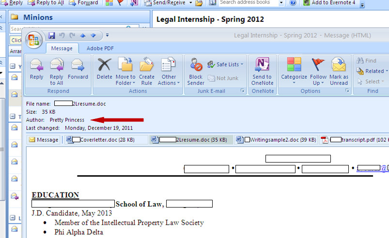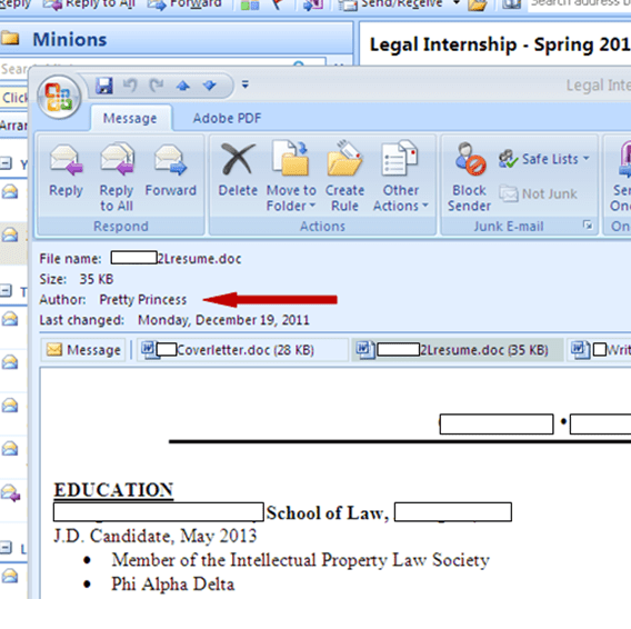 But unfortunately for this law student, when a Word document is viewed inside of Microsoft Office, the Author tag is fairly prominently displayed: