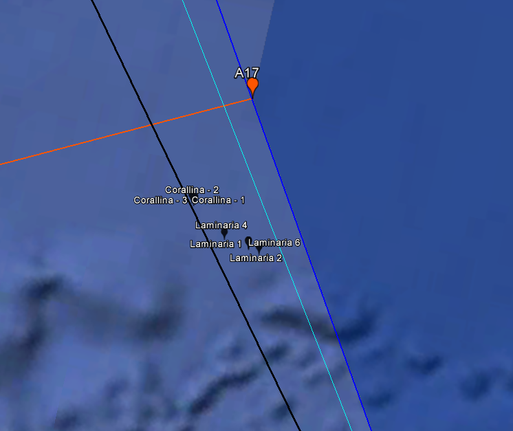 The western and eastern lateral boundaries of Zone C are shown below, with extensions drawn to the northernmost points of Long Reef and Melville, for reference: