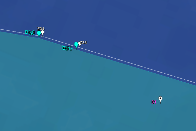 The lateral boundaries of the Zone (marking the width of the Zone as it runs east-west) are more arbitrarily drawn than the longitudinal boundaries. The western lateral boundary of the Zone is particularly odd, as it is in fact two different boundaries. Unlike the eastern boundaries for Zones A and B (which are roughly identical) the western boundaries for Zones A and B show a marked and unexplained divergence. It appears that the western boundary of Zone A (in royal Blue) was established by a line drawn from the mouth of the Kamanasa River through the point of A17, which then terminates where it meets the median boundary between Australia and Indonesia (in white), to intersect at the point marked by point B(e). The western boundary of Zone B (in cyan), although roughly similar, runs at a different angle from Zone A’s boundary. Zone B’s boundary appears to have been established by drawing a line from the mouth of the Tafara River through point B(e), which then terminates where it meets the 200 nautical mile line of Timor’s EEZ (the southern border of Zone A), to intersect at the point marked by B(d):