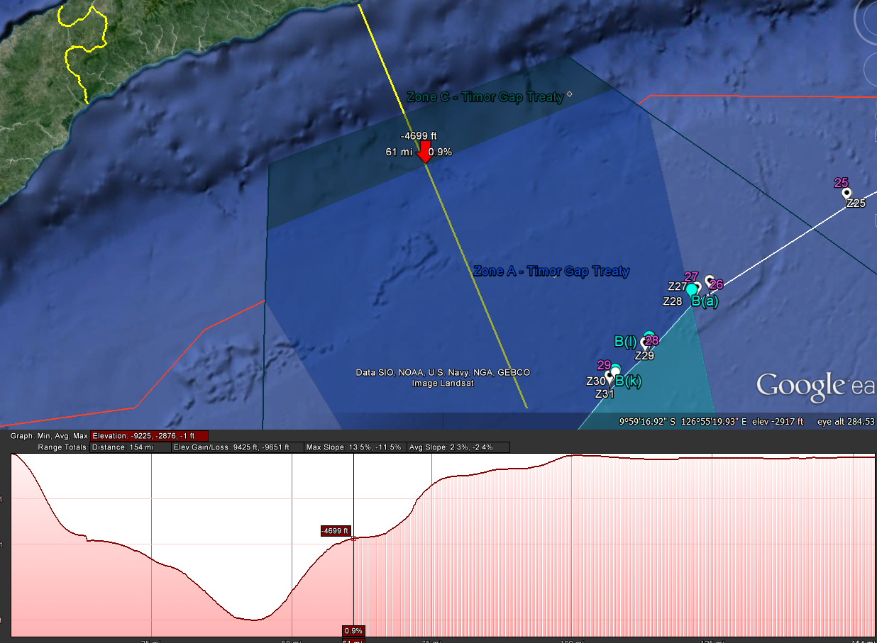 Above: The Zone C-Zone A boundary. Zone C (dark blue area) and Zone A (royal blue area) are demarcated at a boundary drawn on top of the “canyon lip” of the Timor Trough, where the Trough levels off from its steepest drop. Below: Elevation profile of the Timor Sea. Note that the canyon lip of the timor trough corresponded with the red arrow depicted in the above picture.
