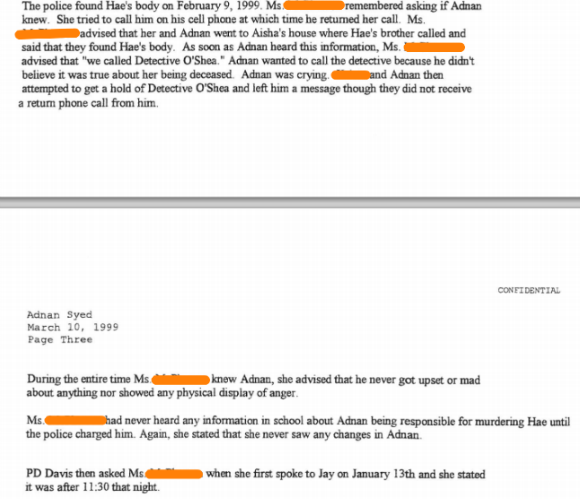 “Adnan called the Baltimore County Police Department to talk to Detective O’Shea. To tell him they’d misidentified this girl, whoever she was.”