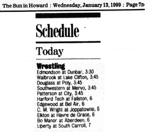 One thing that did strike me as interesting is, that the Jan 14th paper reporting the wrestling scores did not report scores from all of the matches listed as”Today’s Schedule” from the Jan 13th paper. The Jan 13th paper listed 11 matches for that day, but the 14th’s paper only reported scores for seven matches. On closer examination, the 13th’s “Today’s Schedule” also did not report that Randallstown had a match that day. I found that curious….taking a closer look, these are actually two different newspapers from the two different days… One is “The Sun” and the other is “The Sun in Howard”. Of note, the 13th paper is “The Sun in Howard” – is it possible these two papers could have reported different schools on the same day? I have no way to verify what “The Sun” reported on the 13th…if it is possible, then would there have been any expectation for “The Sun in Howard” to necessarily report a match for Woodlawn in “Today’s Schedule”? Not sure, just thought that was interesting…
